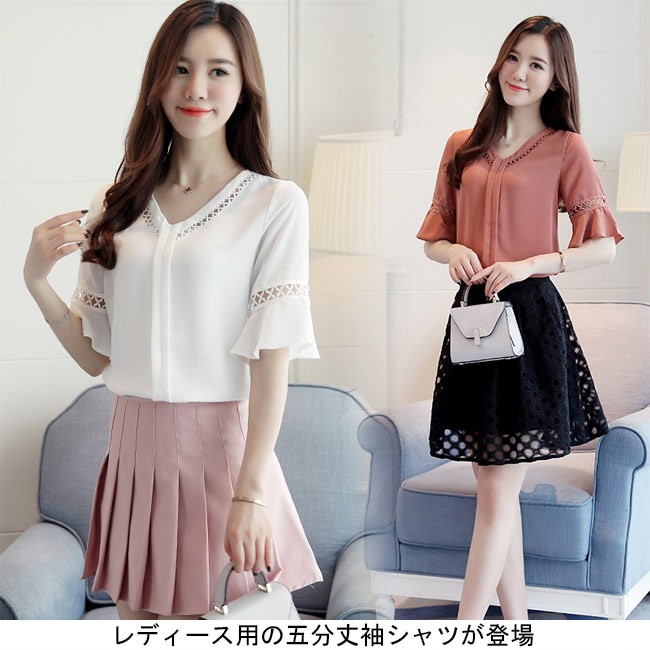 ブラウス Vネック シフォン 五分丈袖 レース Tシャツ ベルスリーブ レディース 薄手 シャツ 春夏秋 トップス 女性用 通勤 レトロ