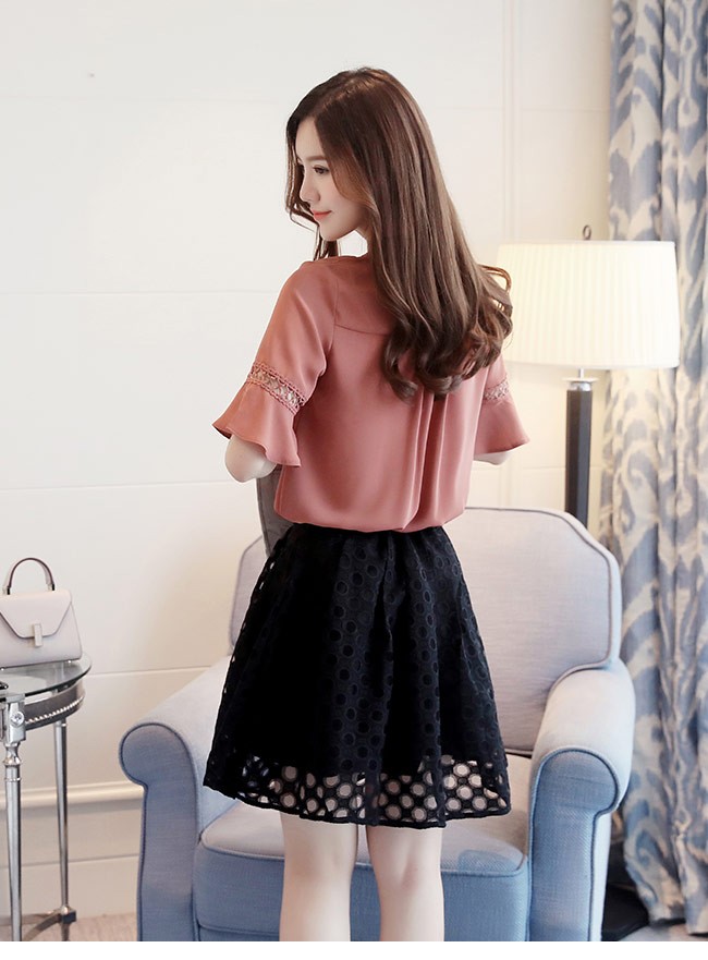 | 商品名 | ブラウス Vネック シフォン 五分丈袖 レース Tシャツ ベルスリーブ レディース 薄手 シャツ 春夏秋 トップス 女性用 通勤 レトロ |