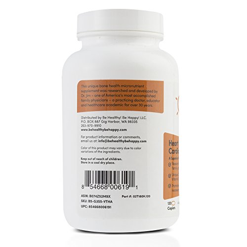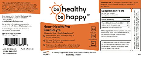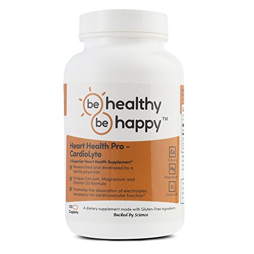 Be Healthy! Be Happy! Heart Health Pro - CardioLyte A Superior Heart Health Supplement provides supplemental dietary calcium and magnesium important for cardiovascular function and blood pressure control. Vitamin D3 has been added to ensure optimal absorption. Be Healthy! Be Happy! believes that health powers the path to happiness. That's why our research team developed this scientifically formulated, proprietary cardiovascular supplement. Researched, designed and developed by one of America's most accomplished Board-Certified family physicians, Heart Health Pro - CardioLyte delivers on the promise of supplement quality and performance. Ingredients include: Calcium citrate 250mg, Vitamin D3 250 IU and Magnesium citrate 25mg. Heart Health Pro - CardioLyte is gluten and sugar-free and manufactured in the USA in strict compliance with the National Product Association Good Manufacturing Practices Standard. Directions: for adults 18 years and older, take one caplet daily with food to promote high performance cardiovascular function. Warning: if you are pregnant, nursing, taking any medications, planning surgery or have any concerns regarding this product, consult your healthcare professional before use. Individuals taking more than 2000 IU of vitamin D daily should have their levels monitored periodically. Keep this and all medications out of reach of children. Disclaimer: these statements have not been evaluated by the FDA. This product is not intended to diagnose, treat, cure or prevent any disease. For questions or comments email us at: info@behealthybehappy.com. And remember, regular exercise, low saturated fat diets, weight control and avoidance of tobacco products are the surest forms of heart health. Power your path to happiness! Store in a cool, dry place.Feature