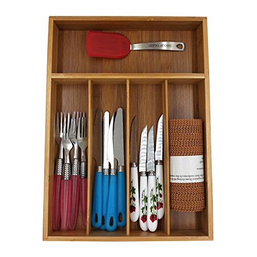 Rightleft 5-slot Bamboo Kitchen Utensil Drawer Organizer Tray, Cutlery Drawer Organizer Tray Layout for Utensils Utility Accessories Storage (14*10.25*2 Inch)