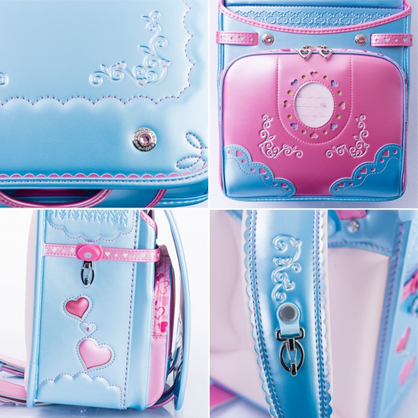 内装:ピンクドット、錠前:ワンタッチロック、補強:ガッチリガード、ポケット:ワイドポケット・内装総内張り・小ナスカン付、肩ベルト:ふわりぃ仕様・長尺・9穴・フリル型・箔押し・右(ハートカン)・左(小ナスカン)、鋲:クリスタルサークル、ナスカン:反射材付、冠裏:レース&ドット、反射材:冠下部・前締め・肩ベルト、固定型持ち手、カラー:パールスカイ×パールピーチ