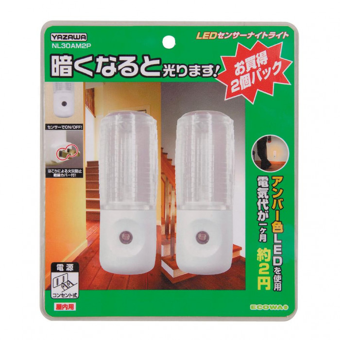 | プラグはホコリや湿気によって発生するトラッキング火災を予防する絶縁カバー付です。コンセントに差し込むだけで明暗センサーが周囲の明るさを感知し、暗くなると自動的に点灯し、明るくなると自動的に消灯します。LEDを使用しておりますので、長寿命で消費電力も少ないため大変経済的です。お買い得な2個パックです。 |