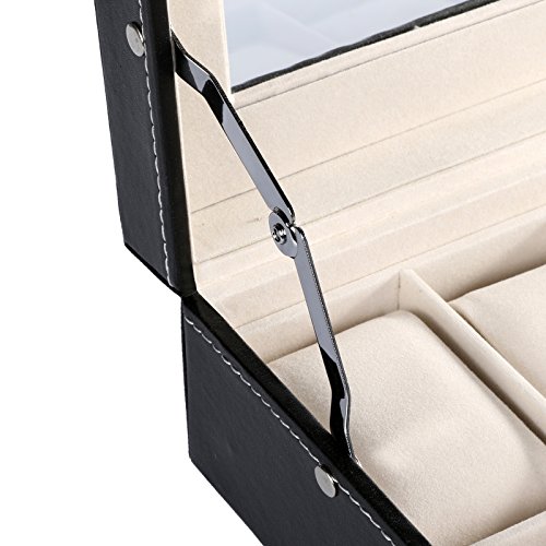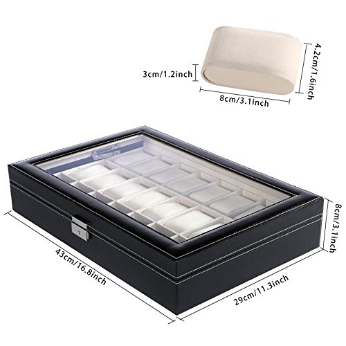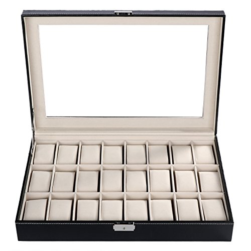 -. Feature : Excellent Quality Material: Made of black leather, lined in soft gray velvet material, keeping your watches dust free. / 24 Large Watch Slots: Capacious room for your large watches, 24 removable velvet pillows included / Protect from Scratch & Damage : Velvet Interior Dividers and super soft removable pillows fit most sizes and styles of watches. Keep your loved watches &jewelry elegantly displayed and in an uP.R.Ight position to avoid sliding around & scratches. / Multi-functional: Perfect for personal use,business use,ideal for home jewelry decoration and free gift for your father, boss, friends or any other watch lovers in your life / Package Content: 1 x Watch Display Case, 24 x Removable Pillow, 1 x Key