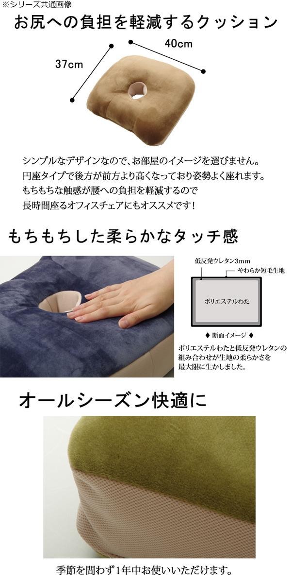 家やオフィスで座るときのお尻への負担を軽くするサポートクッションです。円座タイプになっておりますので通気性もよく快適です。後方が高くなっていますので姿勢よく座るサポートとしてもご使用下さい。 |