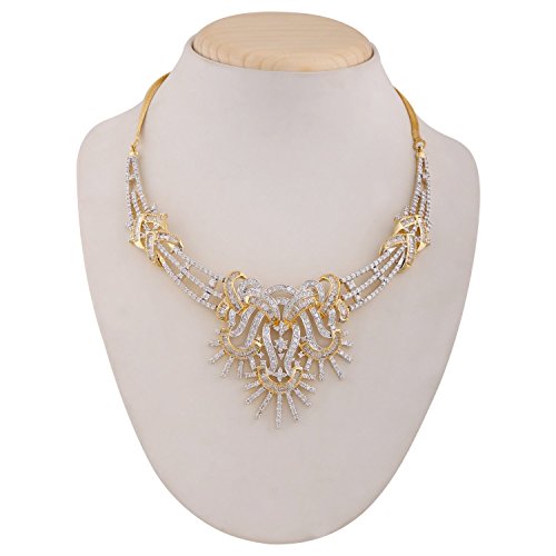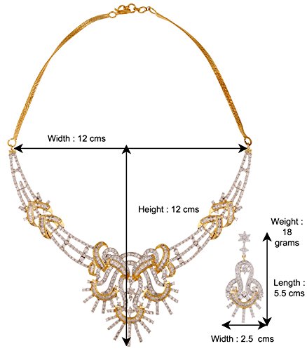 -. Feature : Swasti Jewels Sparkling Zircon Necklace Set a perfect gift for Every P.R.Incess . Ideal Gift for Loved ones. / Style: A gorgeous beautiful american diamond traditional Necklace Set with matching Earrings. Chain is a part of the Product. / Colors: Gold with American Diamonds and Rhodium Plated. No of Items : 1 Necklace with chain + 1 Pair of Earrings ( Size : 5.5 cms x 2.5 cms ; Weight : 18 grams ) / Styling tip: Wear with an ethnic outfit for any occasion. This traditional set will complement any Indian attire. Ideal Gift for Loved ones, Wife, Mother, Sister. Excellent gift for Birthday, Anniversary, Festivals and Celebrations. / Stone Creation : Synthetic ; Stones: Cubic Zirconia & American Diamonds . Swasti Jewels is special and all hand-crafted in our workshops. Our contemporary designs showcase rich Indian heritage. Fulfilled by Amazon for Best Quality and Fast Delivery. Quality Produce of India.