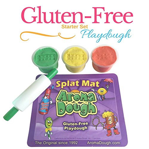 Aroma Dough® Gluten-Free Playdough Rolling Pin Set With Mat And Rolling Pin: Give the gift of creativity to your child with this time-proven favourite amongst little ones. The Aroma Dough® Gluten Free Starter Set includes three 5oz tubs of soft, crumble-free dough along with a non-skid, wipe-clean 9.5 x 7.75 playdough table mat and kids size rolling pin for play dough. The perfect set to keep dough where it should be with easy no-mess clean up! Since 1992, Aroma Dough® has been the leader in gluten-free, non-allergenic, eco friendly play dough that is safe for ALL children, including children with special needs and those suffering from celiac disease, autism and ADHD. We are the proud winner of the Seal of Approval award by the Parent's Choice Foundation. WHAT'S IN: -All of our organic play dough sets are Gluten Free and curated from the finest 100% organic, wheat-free rice flour, sodium, water, moisturizing oils, and natural aromas (no perfumes or pretend "scents"). -Aroma Dough® gluten free organic modeling dough stays moist and pliable long after the others you've tried have dried up! -Non-crumbling washable playdough formula washes easily from carpet and clothing (no kidding, really!) WHAT'S OUT: -ALL NATURAL AROMAS - no Perfumes, "Scents" or Chemicals. -Our playdough 3-pack does not contain the following allergens: No Wheat, No Soy, No Dairy/Casein, No Nuts, No Latex, No Egg, No Corn, No Mess. -Natural formula baby safe play dough is 100% safe for little ones - Conforms to ASTM-D4236 Proudly Made in the USA. Feature