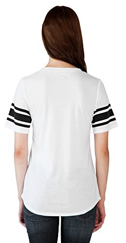 Graphic t-shirts have Minnie Mouse prints - officially licensed by Disney. Football jersey style with stripes on the short sleeves. Junior/teenage sizing; runs smaller/slimmer than women's sizing - you may want to order one size larger. Lightweight, thin fabric - soft and comfortable. Machine wash cold with like colors and tumble dry low.Feature