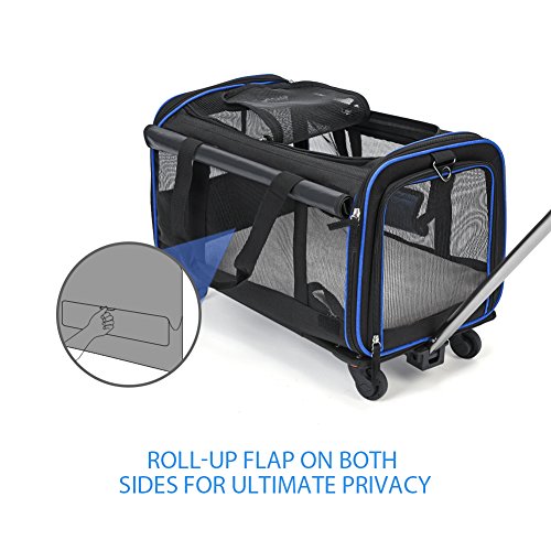 - The on wheel carrier make it easier to take your pet to the vet, groomers, or even through the airport so you can take them with you on vacation. - Top and side entry options make it much easier to comfortably load pets in the carrier. - Easy to clean and folds flat for storage. - Side and top zipper openings allows you to safely interact and comfort your pet while traveling. - The cozy fleece pads of dog / cat carrier purse can be completely removed and washable. - The extendable handle, carrying handles and adjustable shoulder strap allow for many carrying options.