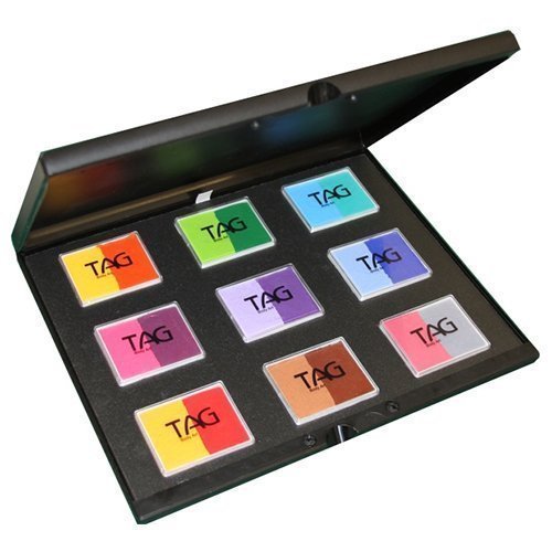 Professional Face Painting pallette containing 9 - 50g Regular Split Cakes. Colors include; Golden Orange / Red Orange / Yellow Royal Blue / Powder Blue Lilac / Purple Light Green / Green Teal / Light Blue Brown / Mid Brown Berry Wine / Pink Grey / Rose PinkFeature