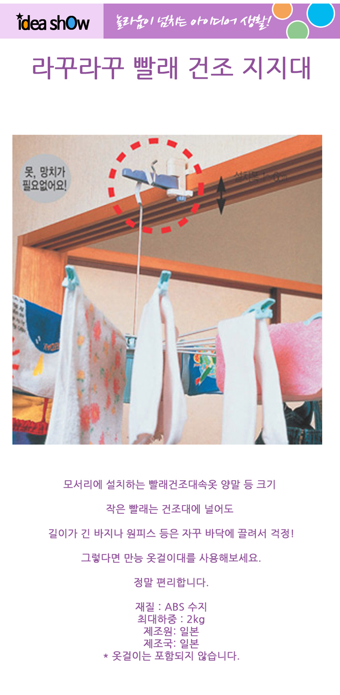 모서리에 설치하는 빨래건조대속옷 양말 등 크기 작은 빨래는 건조대에 널어도 길이가 긴 바지나 원피스 등은 자꾸 바닥에 끌려서 걱정!그렇다면 만능 옷걸이대를 사용해보세요.정말 편리합니다.재질 : ABS 수지최대하중 : 2kg* 옷걸이는 포함되지 않습니다.