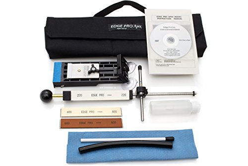 The Apex Model Edge Pro Key Benefits : Patented knife guide system will sharpen any size or shape blade ( up to 3.5" wide ), including serrated knives. Simple system determines the best angle. Knives can be sharpened at exactly the same angle every time, making re-sharpening so fast you will never work with a dull blade again. Custom formulated water stones free you from messy, gummed - up oil stones. Long lasting and inexpensive to replace. Easy to change with a simple twist of the knob. Removes far less metal than electric sharpeners or grinders, eliminating wavy edges, adding to the life and performance of your knives. Removes nicks and dings without distorting the knife edge. Creates no heat - will not damage the temper of your knives. Sets up in seconds on any smooth surface. No power required. Comes with convenient carrying case - very portable. Requires no maintenance other than routine cleaning. Patented Knife guide system does not clamp the blade. Adjustable sharpening angles, from 10 , 15, 18, 21, and 24 degrees. Water Stones are mounted on plates so they can be changed in seconds with a twist of the knob. Manufactured from the highest quality materials in Hood River, Oregon, US. Apex Model Edge Pro Sharpening System Kit 2: 3 Water Stones in 220 Grit Medium Fine, and 400 Grit Fine, and 600 Grit Extra Fine; 8" 1200 Grit Ceramic Hone, Instructional DVD, Instructional Manual, Cloth, & Water bottle enclosed in a black Cordura Carrying case.