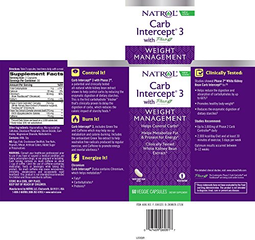 -. Feature : HELPS CONTROL CARBS: Natrol® Carb Intercept® is a White Kidney Bean extract that helps reduce the digestion and absorption of carbohydrates by up to 66%.* / METABOLISM SUPPORT: Carb Intercept also contains Chromium, which helps metabolize fats, carbohydrates and proteins.* / PROMOTES HEALTHY BODYWEIGHT: Taking Natrol Carb Intercept, along with following a healthy diet and exercise program can help you achieve healthy body weight.* / CLINICALLY TESTED: Phase 2 Carb Controller ® is the first carbohydrate "blocker" clinically proven to reduce the caloric impact of starchy foods by delaying the digestion of carbs. *