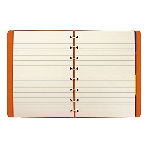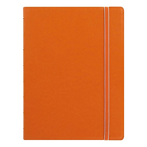 Filofax Notebook. A soft, tactile leather look cover, with a unique flexibility. A contemporary and stylish look. Cover with integral reinforcement that can be folded open by a full 360˚. Elastic closure. 112 ruled pages, cream paper. Index, storage pocket and page-marker. Free refill, 8 quad pages, and 8 plain pages. 30% post-consumer recycled paper. A5 Size. 8-1/4" x 5-13/16. Orange