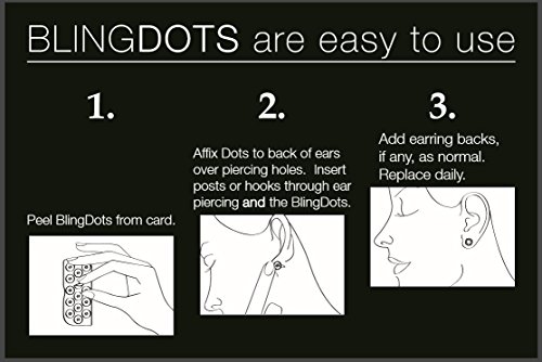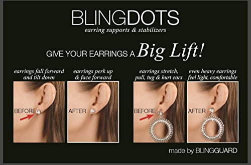 Studio : BlingGuard Publisher : BlingGuard Binding : Misc. Product Description Introducing new BlingDots, Earring Supports and Stabilizers. Whether you're rocking a glam set of chandelier earrings, classic hoops or elegant studs, BlingDots hold your jewelry in place - right where they belong - all day and all night. Easy to apply, these discreet and disposable backs relieve the weight and pressure of your earrings, lifting them up on the ear lobe and positioning them perfectly. BlingDots also work with clip-on earrings and your favorite pins, brooches and badges. 0