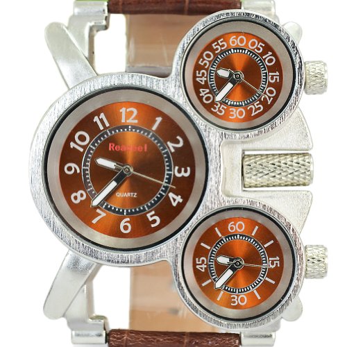 Oulm Three Time Display Quartz Mens Military Army Sport Wrist Watch Brown Leather