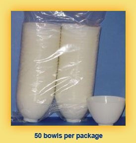 - 50 disposable bowls per package - used to mix alginates, plaster, and stone without the messy cleanup of the old rubber bowl, also very useful mixing hair dyes, makeup, frostings, any household mixtures, resins, and glues.