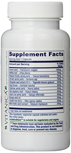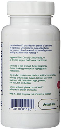 -. Binding : Health and Beauty -. Brand : Vitanica -. EAN : 0708118011900 -. Feature : Vitanica lactation blend 60 capsules / Country of origin usa / Nursing support / This product may be fulfilled in an alternative package -. IsAdultProduct : 0 -. Label : Vitanica -. LegalDisclaimer : This is a statement of nutritional support. This statement has not been evaluated by the Food and Drug Administration. This product is not intended to diagnose, treat, cure, or prevent any disease. -. Manufacturer : Vitanica -. MPN : 01190-0 -. NumberOfItems : 1 -. PackageQuantity : 1 -. PartNumber : 01190-0 -. ProductGroup : Health and Beauty -. ProductTypeName : HEALTH_PERSONAL_CARE -. PublicationDate : 2011-04-11 -. Publisher : Vitanica -. Size : 60 -. Studio : Vitanica -. Title : Vitanica Lactationblend, Nursing Support, 60 Capsules -. UPC : 708118021909