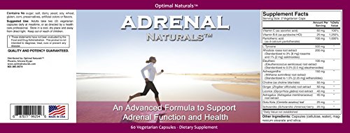 -. Binding : Health and Beauty -. Brand : Optimal Naturals -. EAN : 0687077992546 -. Feature : NATURAL ADRENAL SUPPORT - Our Adrenal Supplement offers a Full-Spectrum of (13) Nutrients & Herbs / COMPARE 500MG L-TYROSINE & STANDARDIZED INGREDIENTS vs. 380mg & non-standardized in other products. / HELPS SUPPORT & BALANCE healthy adrenal function, stress response, energy and adrenal hormone levels / PURE INGREDIENTS. No Sugar, Salt, Dairy, Yeast, Soy, Wheat, Gluten, Corn, Preservatives, Artificial Colors or Flavors / 100% SATISFACTION GUARANTEED. If you are not satisfied for any reason, simply request a refund within ninety days of the purchase date -. IsAdultProduct : 0 -. Label : Optimal Naturals -. LegalDisclaimer : The statements and products shown have not been evaluated by the US Food and Drug Administration. These products are not intended to diagnose, treat, cure, or prevent any disease. Those seeking treatment for a specific disease should consult a qualified physician. All supplements should be taken as part of a healthy lifestyle. -. Manufacturer : Optimal Naturals -. PackageQuantity : 1 -. ProductGroup : Health and Beauty -. ProductTypeName : HEALTH_PERSONAL_CARE -. Publisher : Optimal Naturals -. Studio : Optimal Naturals -. Title : Adrenal Fatigue Support Supplement • Adrenal Complex Packed w/ Essential Nutrients & Herbs to Support Healthy Adrenal Cortex Function and Response to Stress, Immune System Strength, and Energy Levels. -. UPC : 687077992546