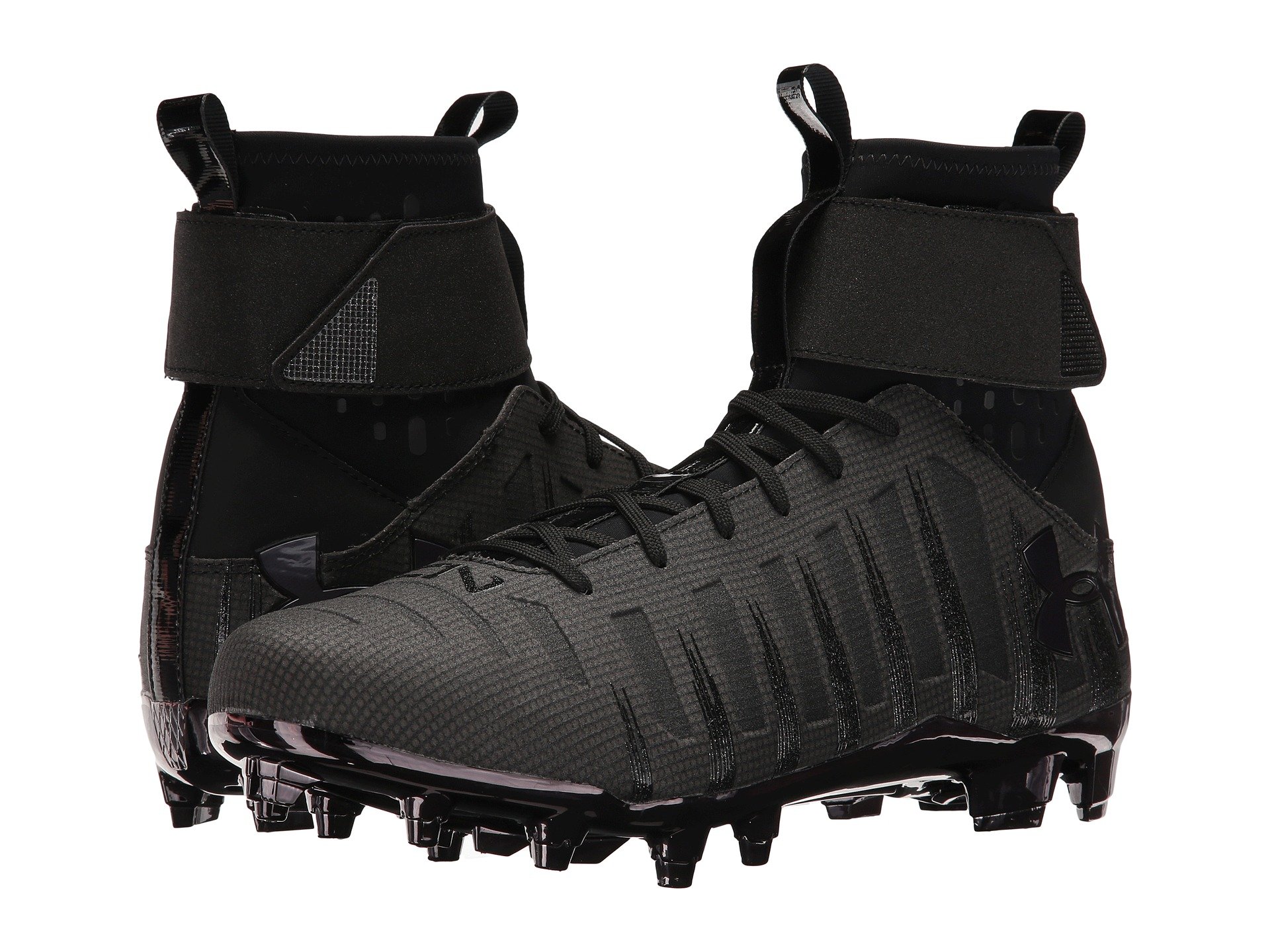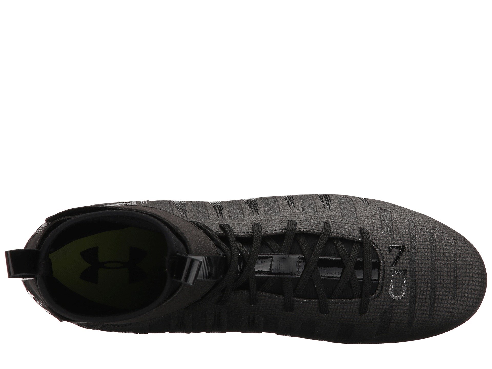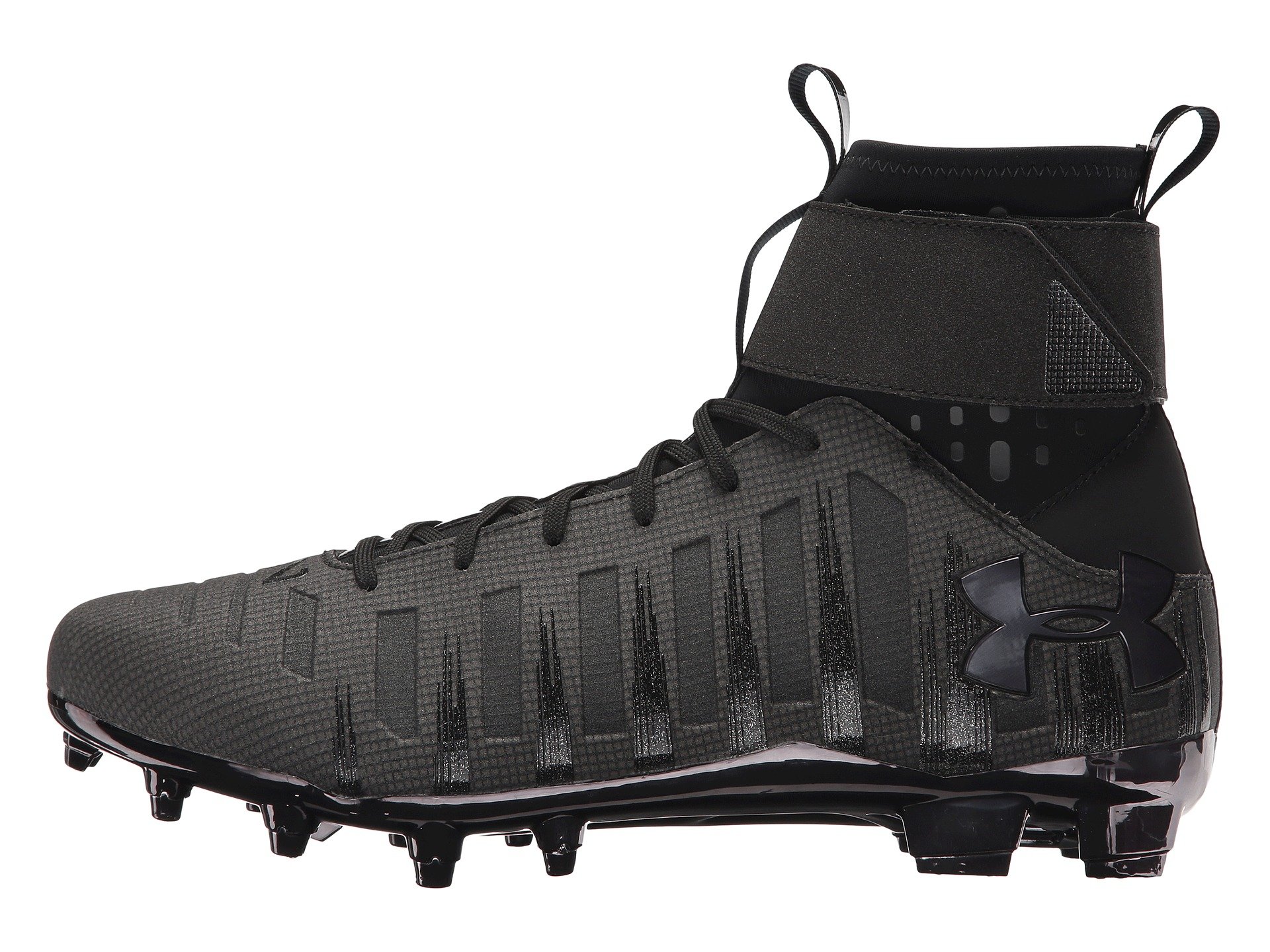 | Product Information SKU: #8118826You ain't no Cam but you can roll like the 'big cat' himself in his signature football shoe?the UA Cam Highlight hi-top molded-cleats from Under Armour?! Lightweight, engineered chrome synthetic upper offers exceptional step-in comfort in a sleek, fast-looking design.Form-fitting CompFit? ankle sleeve gives you an incredible snug feel and an extra boost of speed.Foot-forming 4-D Foam? footbed conforms to your foot's exact shape, eliminating slippage.Traditional lacing closure with an integrated 3D-molded tongue hugs the foot for optimal fit and feel.Integrated carbon fiber 'wings' lock your heel in for maximum stability and responsiveness.Full-length Micro G? foam cushions landings and helps with explosive takeoffs.Embossed C1N logo on outer heel and tongue.Embossed UA logo on toe box and medial side.The perfect blend of full-length Carbon and ultrastrong Pebax delivers unprecedented lightweight structure.Secondary cleats engage to give the player added bite for razor-sharp cuts and explosive acceleration.Imported.Product measurements were taken using size 12, width D - Medium. Please note that measurements may vary by size.Weight of footwear is based on a single item, not a pair.Measurements: Weight: 14 oz Shaft: 8 in |