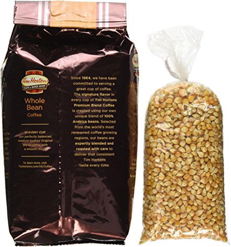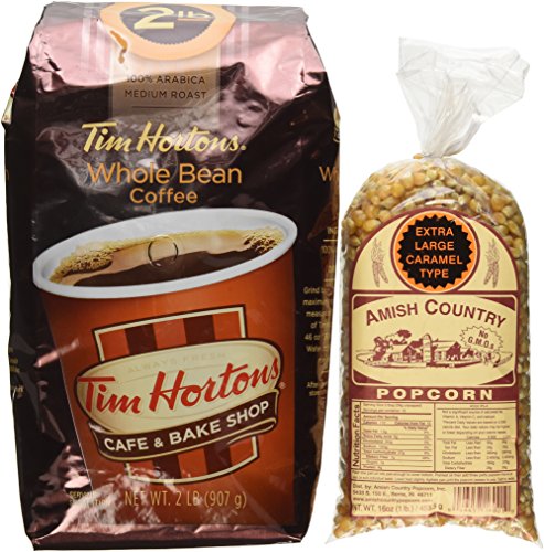 Title : Tim Horton's Whole Bean Coffee Medium Roast 100% Arabica 2 Pound Bag, This Includes a Free 1 Pound Bag of Amish Country Popcorn.