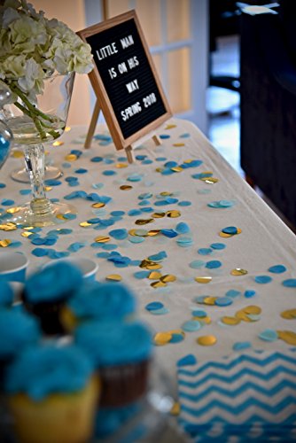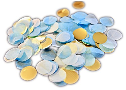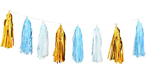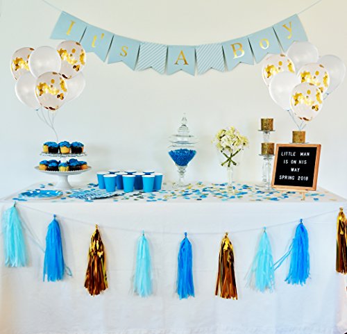 - DON’T SKIMP - This is a special day, and we give you more than you’ll need to ensure your venue will be fully decked out. No need to fill in gaps at a retail store! Set includes 1 premium gold foil cardstock banner, 12 balloons (6 gold foil confetti, 6 iridescent baby blue), 9 tassels (3 royal blue, 3 cool blue, 3 ice blue), 1,000 count mixed gold foil, cool blue and ice blue table confetti, 1 bundle of twine (45 feet).
