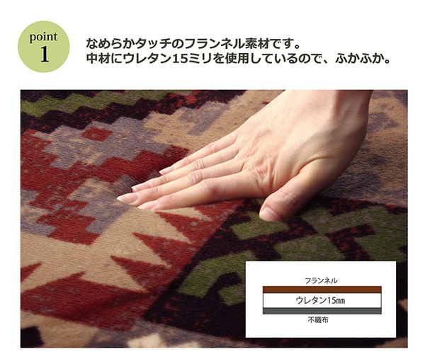なめらかな肌触りのフラネルを使用したラグです。中材にウレタンを15mm使用しているため、ふっくらとしています。ホットカーペットカバーとしてもご使用いただけます。