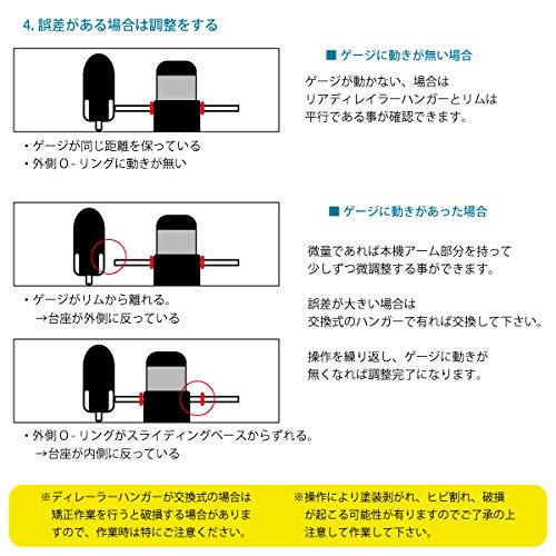 【조작 순서】 1디 레이 라를 떼내고, 본기를 설치.2게이지를 림에 붙이고, O-링을 베이스에 이동하여 기준의 거리로 마크 한다.3시계의 3,6,9,12 시의 방향으로 림과의 간격을 조사합니다. →틈이 없는 경우는 행거와 림은 평행이고, 문제 없습니다. →림과의 사이에 틈이 어느(있는),또는 마크 했 O-링이 다른 것에 이동 하는 경우는 조정이 필요합니다.오차가 소량이면 본기의 암부 를 가지고 조금씩 교정이 가능합니다. ※디 레이 라 행거가 교환식의 경우는 교정 작업을 하면 파손 될 수 있기 때문에,작업 때는 특히 주의하여 주십시오. ※조작에 의해 도장 벗겨지고, 금(살갗이 튼 자리) 붕괴,파손이 일어나는 가능성이 있기 때문에 승낙 후 주의해 작업해 주십시오.