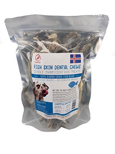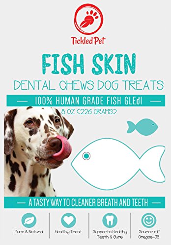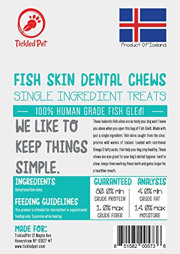 -. Binding : Misc. -. Brand : TickledPet -. EAN : 0851582005705 -. Feature : JUST ONE INGREDIENT: This high protein dog chew is made with only dehydrated wild caught Icelandic cod and loaded with Omega-3s. / DENTAL DOG TREAT: Gnawing on these longer lasting dental chews can help clean teeth and support healthy gums. / HUMAN GRADE: TickledPet fish skins meets the rigorous FDA safety standards to use the label 'human grade', ensuring the highest quality dog treats. / ALL NATURAL: This healthy dog chew is made with no by-products, preservatives or fillers and is Non-GMO Project verified. / Nothing from China in these tasty treats. 8 OZ of pure yummy dog treat bliss. -. Label : TickledPet -. Manufacturer : TickledPet -. PackageQuantity : 1 -. ProductGroup : Pet Products -. ProductTypeName : PET_SUPPLIES -. Publisher : TickledPet -. Studio : TickledPet -. Title : TickedPet Icelandic Cod Fish Skin Treats For Dogs - Wild Caught Single Ingredient Chews -. UPC : 851582005705