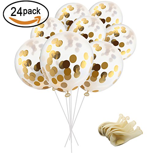 -. Feature : Function:confetti balloons can meet your needs for party wedding decorations. You can also use them proposal to your lover. / Size:uninflated ballon is 13 cm long and 6.5 cm wide, the inflatable diameter is approx. 30.5 cm/ 12 inches, confetti is 2.5 cm in diameter. / Quantity:24 pieces confetti balloons can meet your quantities need. / Wide applications: this set of confetti balloons can be applied in many different situations, such as festival party,anniversary party, birthday party and so on. / Due to the gold confetti is heavier than helium, the gold confetti moves in the direction of gravity. So before you inflate the balloon, spray a little water into the balloon or blow a little water through your mouth that the moisture will help the gold confetti stick to the balloon. Beyond that, rubbing the outer side of the balloon with a dry towel will also help the gold confetti stick to the balloon.