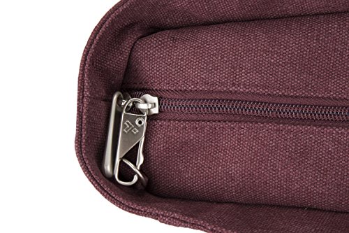 -. Feature : Roomy compartment with zippered RFID blocking pocket, 2 open top wall pockets and a tethered key clip with LED lightPATENT: http://www.travelonbags.com/patent-marking / Easy access, locking front zippered pocket / Two hidden zippered side pockets / Rear zippered pocket; Two slash-resistant, removable shoulder straps for customized comfort / 13x10x4