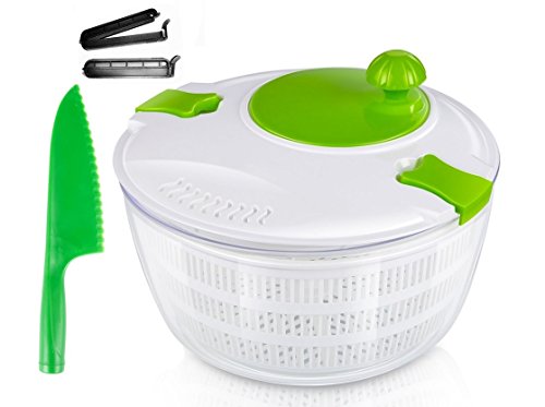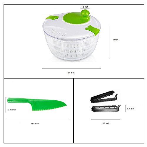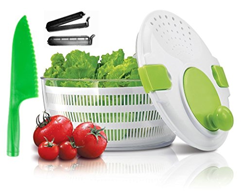 Studio : Platinum Sales Group Publisher : Platinum Sales Group Product Description SALAD SPINNER: A salad spinner is the ultimate kitchen tool for salad lovers. Salad spinners include an outer bowl with an inner removable strainer basket. The cover contains a spinning mechanism that when initiated causes the inside strainer to rotate rapidly. Using a Salad Spinner after washing can provide a crisper salad by removing the excess water from your salad greens - the perfect lettuce dryer. Salad Spinners do a great job keeping lettuce undamaged while cleaning the leaves. The removal of water from the leaves allows for a more evenly dressed salad. Greens should always be dry before refrigerated storage, to prevent wilting thereby keeping your salad crisp. A Salad Spinner is the perfect salad dryer and will help if you are meal prepping for your week. PLASTIC LETTUCE KNIFE: A major problem with early salad preparation is the browning and wilting of the lettuce. Unlike a metal kitchen knife, a serrated plastic lettuce knife will not oxidize lettuce so the edges won’t turn brown - keeping a salad looking crisp and fresh. Designed with an angled blade and evenly serrated edge allows for clean and neat cuts leaving your salad looking fresh and desirable. Please note the use of this knife is not limited to lettuce. This is the perfect fruit knife, cake knife and vegetable chopping knife. AIRTIGHT BAG CLIPS: Gone are the days last minute salad preparation! Simply place your prepared lettuce in a bag, let out the excess air and seal the bag with an airtight clip and place in your refrigerator. Airtight storage is proven to extend the shelf life of perishables. SATISFACTION GUARANTEED: At Olivia’s Home Goods we take pride in our quality kitchenware. If you are not completely satisfied, please contact us for a replacement or refund. 0 |