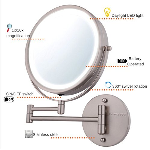 - COMPREHENSIVE – This dual-sided 360° swivel design luxury mirror features 1x10x magnification. 1x for a great view of your entire face all at once, and 10x for precision, because every detail counts (8.5” diameter)