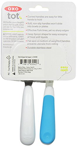 -. Feature : Soft, non-slip handles are easy for little hands to hold / Handles are curved to prevent slipping into bowl or plate / Effective fork tines, yet no sharp edges, deep spoon shape for easier scooping of food and liquids / Sturdy stainless steel for durability / BPA, phthalate and pvc free