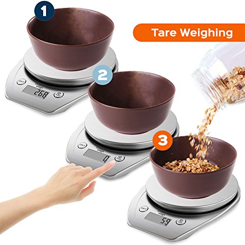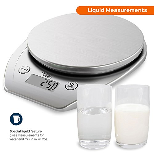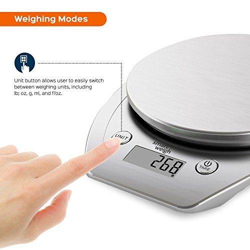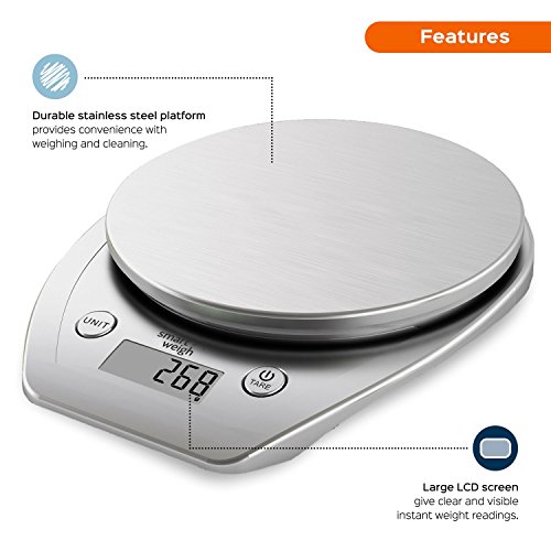 - Smart Design – Kitchen scale is crafted with a stainless steel platform providing durability with a stylish look. Platform supports a capacity of 11lbs/5kg. Unit, power and tare buttons are large and accessible, measurements are shown on a large LCD display and are easy to read while multitasking in the kitchen