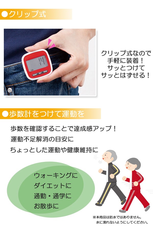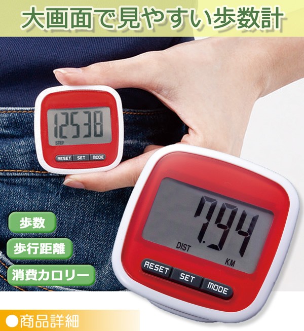 | 大画面で表示が見やすい歩数計。身に着けて計測する振り子式の歩数計です。歩数以外にも消費カロリーと歩行距離が計測できます。クリップ式なので手軽に装着。ウォーキングに、ダイエットに、通勤・通学に、お散歩に。歩数を確認することで達成感もアップ!運動不足の解消や健康維持にもつながります。 歩数計/歩数/歩行距離/消費カロリー/ウォーキング/運動/エクササイズ/散歩/健康管理 |