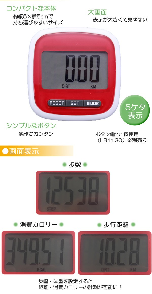 | 大画面で表示が見やすい歩数計。身に着けて計測する振り子式の歩数計です。歩数以外にも消費カロリーと歩行距離が計測できます。3つのボタンで操作もカンタン!クリップ式なので手軽に装着できます。ウォーキングに、ダイエットに、通勤・通学に、お散歩に。歩数を確認することで達成感もアップ!運動不足の解消や健康維持にもつながります。 |