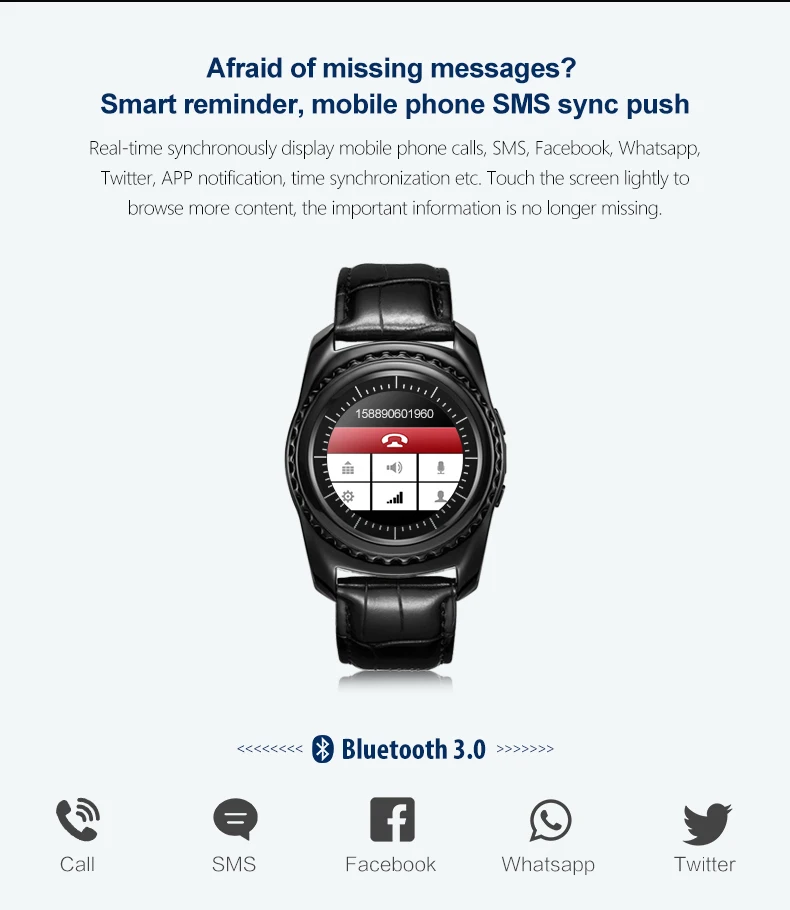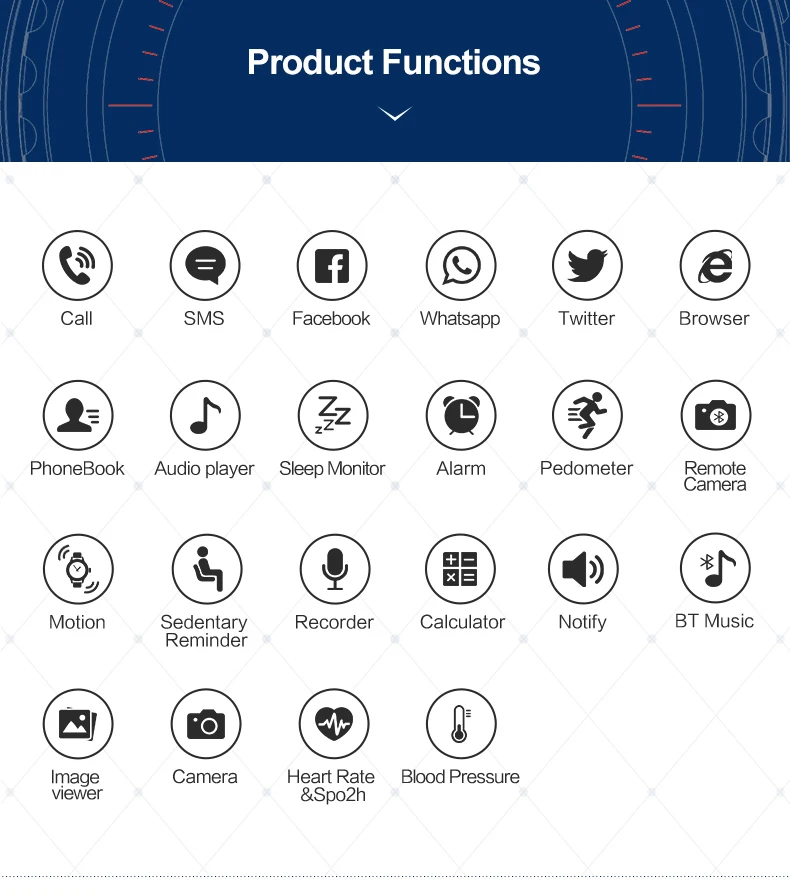 Function:Dial Call,Answer Call,Chronograph,Passometer,Fitness Tracker,Month,Heart Rate Tracker,Push Message,Message Reminder,Alarm Clock,World Time,Interactive Music,Call Reminder,Calendar,Sleep Tracker