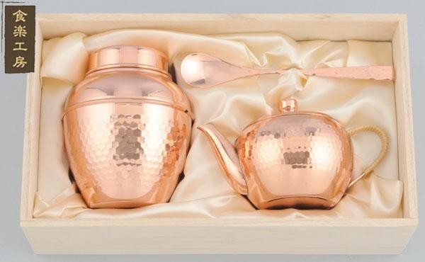 | 素材・材質 | 本体:銅(内面:メッキ) 茶壺内蓋:銅(メッキ)、茶壺ツマミ:真鍮 急須柄:銅・籐、ストレーナー:ステンレス 長茶匙:銅 仕上げ:ミラー |