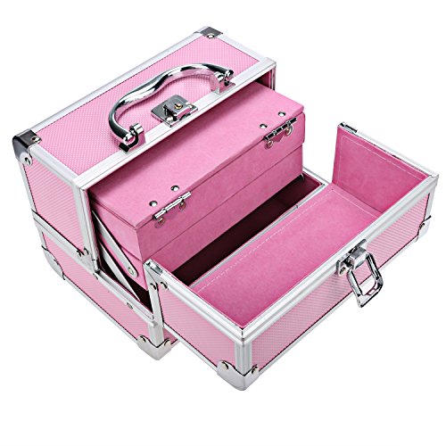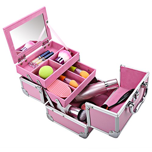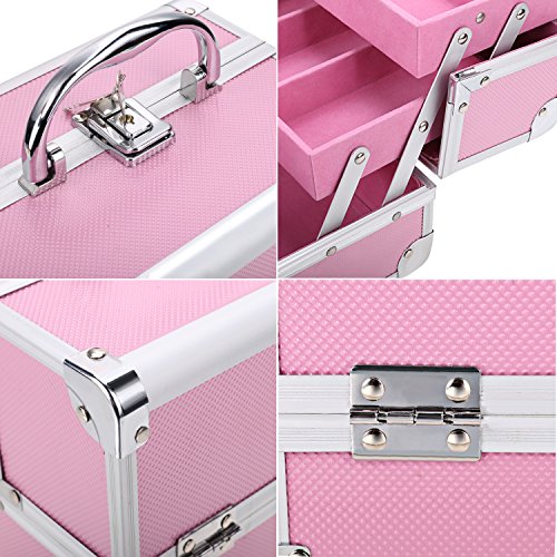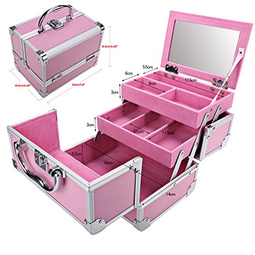 Makeup Train Travel Case 3-Tier Portable Lockable Cosmetic Jewelry Organizer Box with Mirror (PINK-PINK)