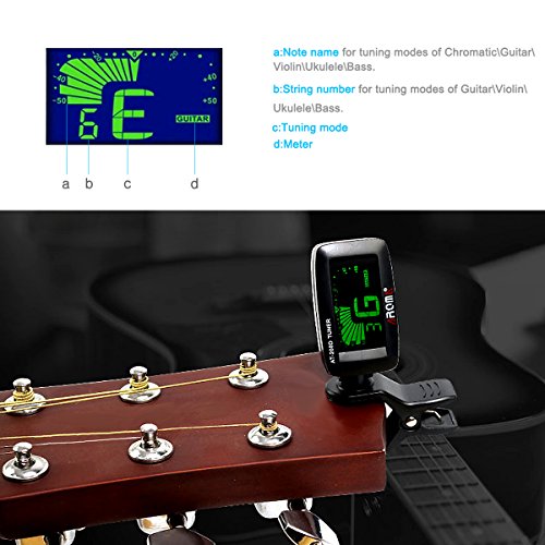LC Prime® Guitar Tuner, LCD Mini Clip-On Tuner, for Chromatic Guitar Violin Ukulele Bass Specifications: 1.Tuning modes include: Guitar, Bass, Ukulele, Violin and Chromatic