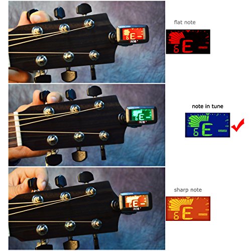 ✔︎ VIBRATION TUNING OF CLIP-ON TUNER: clip tuner on your instrument and turn on, play a single note on your instrument, it will detect pitches directly from your instruments' vibrations. The note name (and string number) will appear in the display, the screen color change and the mater moves (note is tune - screen turns green and the maters in the center appears; flat (or sharp) note - screen turns red (or orange) and the maters in the left (or right) appears)