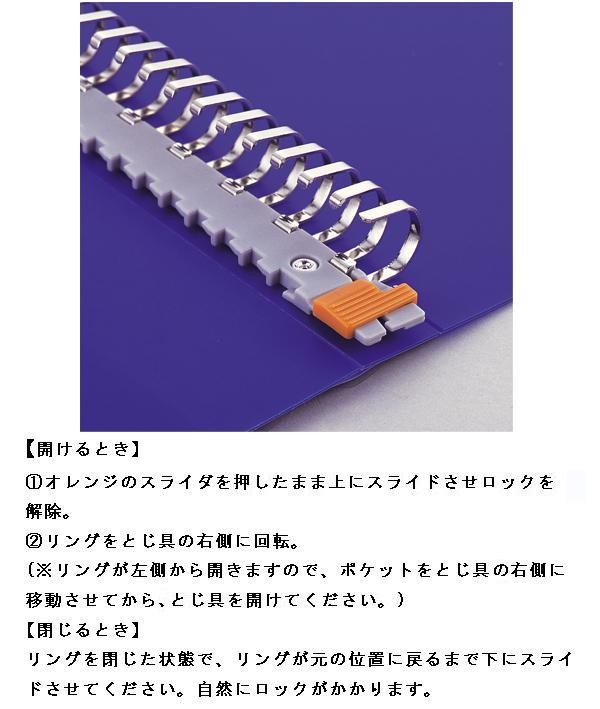 | リングに継ぎ目がないとじ具なので、ポケットの回転がスムーズで、とじ具が薄いから背幅がとてもスリムです。交換式背見出しはタイトル記入に便利です。 |