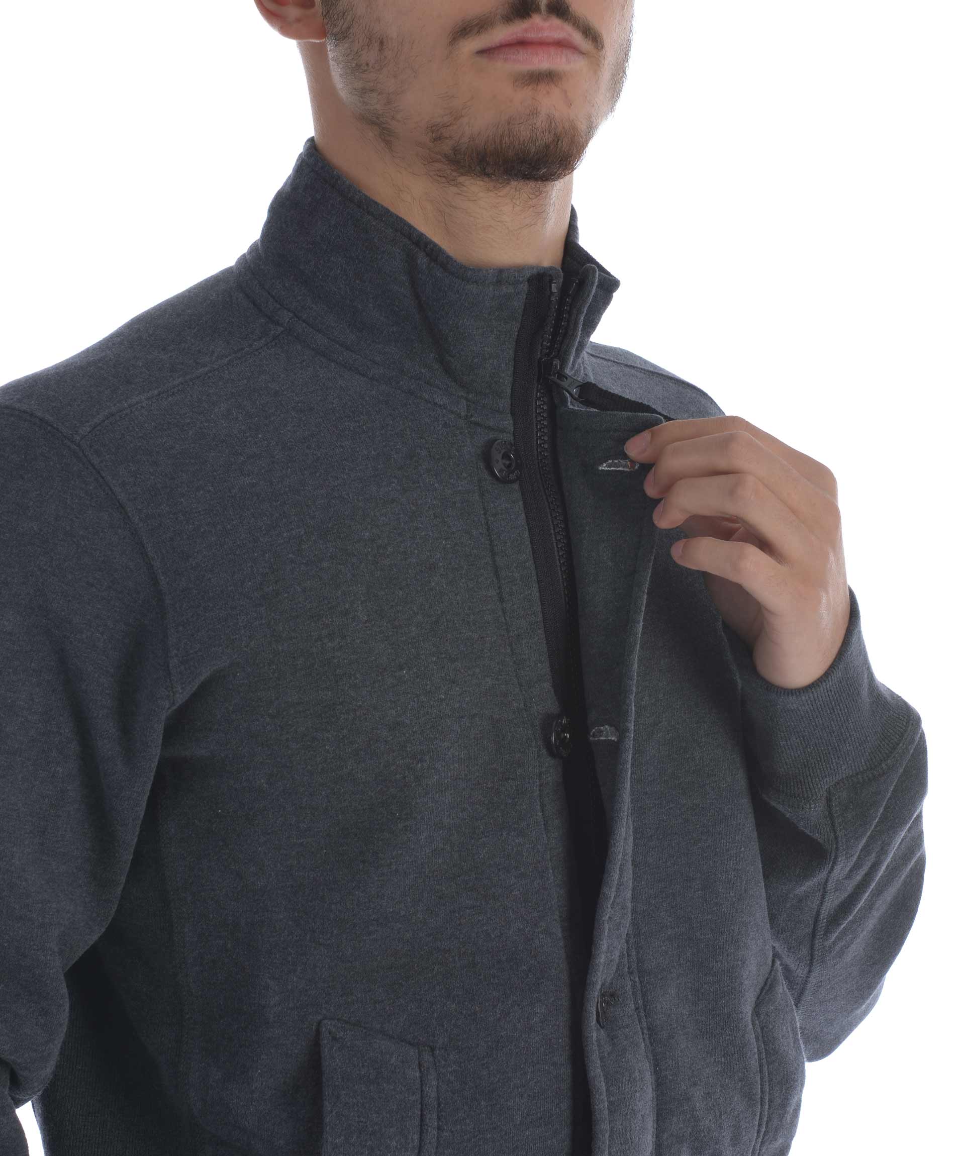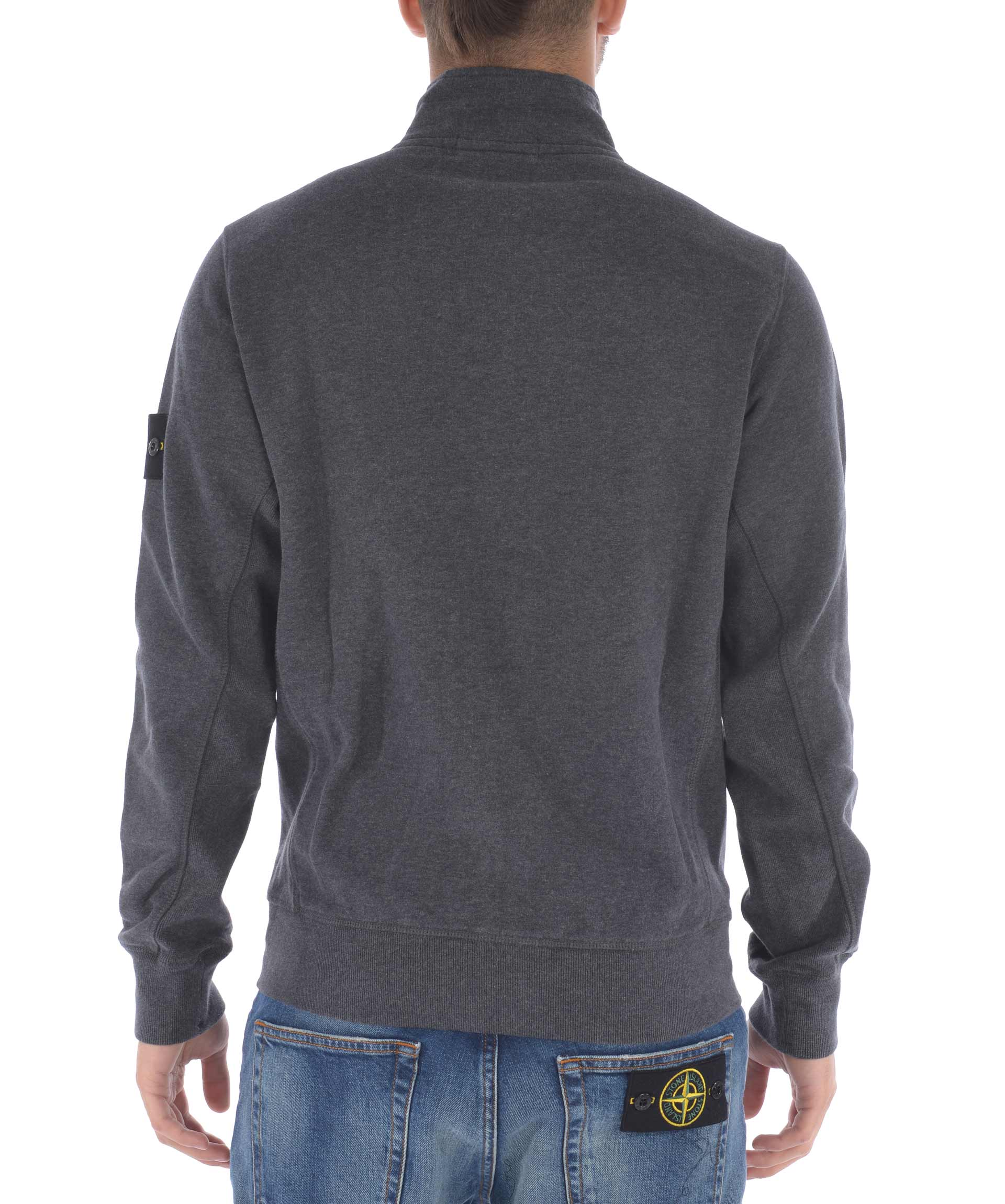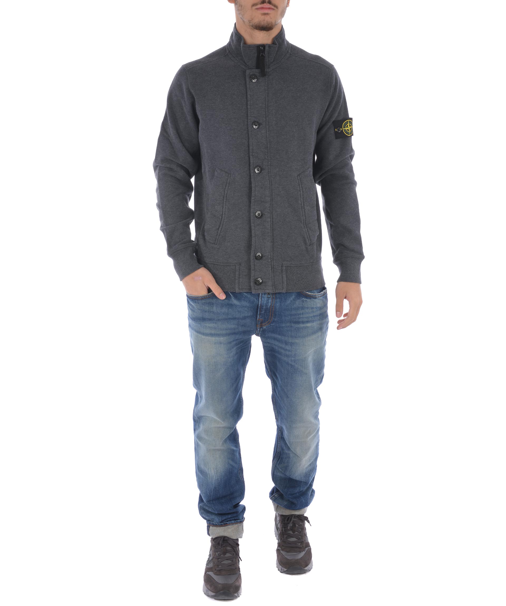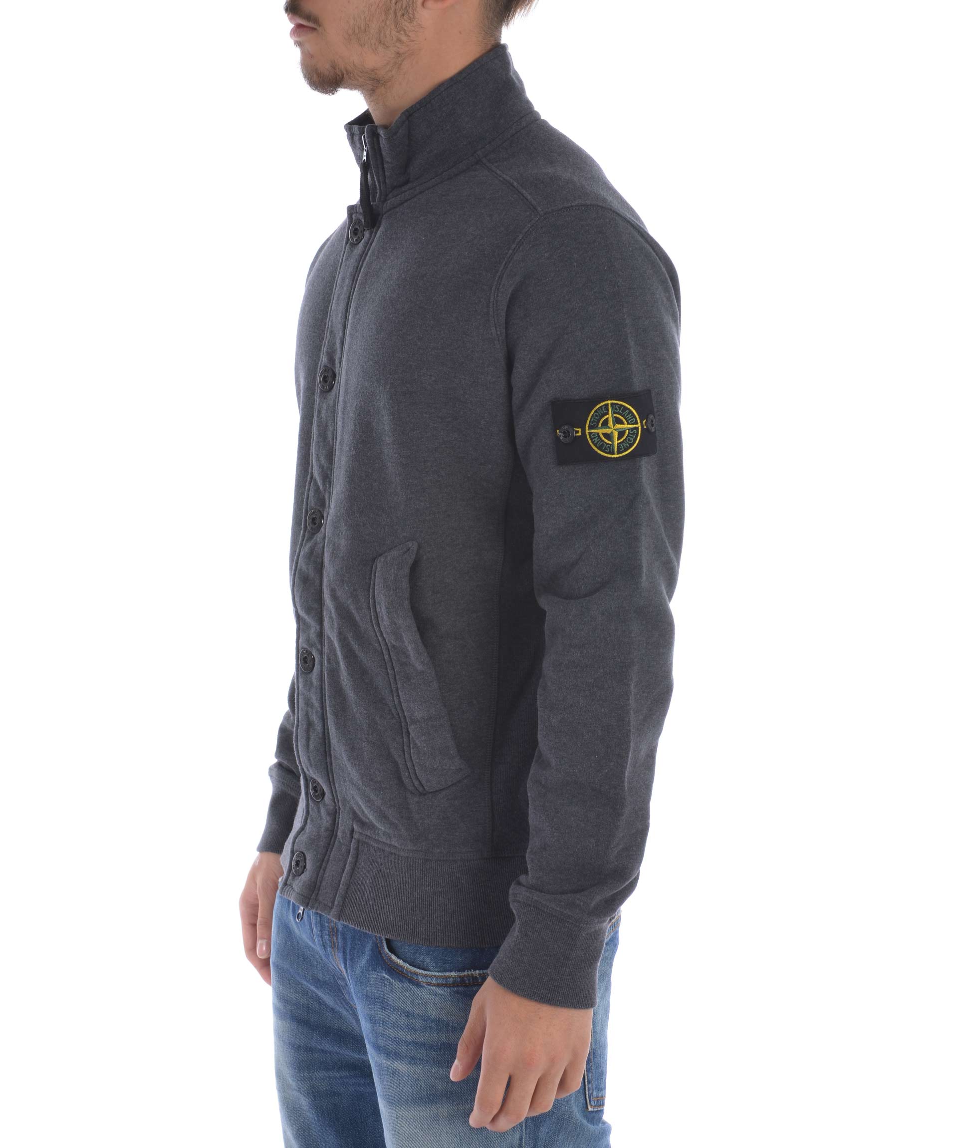 Felpa Stone Island in cotone Grigio scuro melange. Collo alto. Chiusura frontale con zip doppio cursore nascosta e bottoni logati a vista. Tasche frontali. Polsi, fondo ed interno collo a costine. Patch logo in lana sulla manica sinistra, removibile.