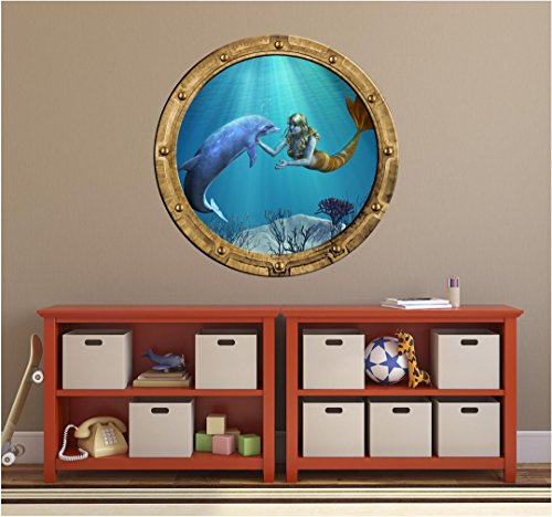 -. Title : 36" Port Scape DECAL! MERMAID w/ DOLPHIN #1 RUSTIC Porthole Wall Vinyl Sticker Mural Decor