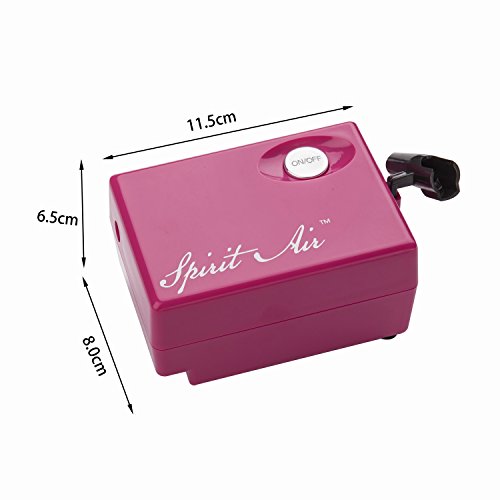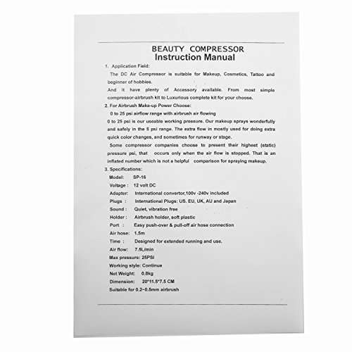 Studio : Fy-light Publisher : Fy-light Binding : Office Product Product Description This amazing Spirit Air SP16 airbrush kit is ideal for Makeup, Manicure, Temporary Tattoo, Cake Decorating and other applications. The Super Quiet Mini Airbrush Compressor with 3 levels of pressure adjustable Airflow Control Settings, Operates at 12V DC with a International converter 110V-240V AC plug in Adapter. Professional Precision Single-Action Gravity Feed Airbrush with a 0.4mm Tip 1/15 oz Cup. Airbrush is designed to provide an ultra fine mist of makeup, allowing you to achieve a flawless, soft natural complexion. Technical Details Air Compressor:Size: 4.5×3.15×2.56 Inches Voltage: 12 volt DC Adapter: International convertor,100v -240v included Airbrush Holder: Soft plastic Port: Easy push-on pull-off air hose connection Air hose: 14.92 Feet Air flow: 7.5L/min Max pressure: 25 psi Suitable for 0.2-0.5mm airbrush Supporting the airbrush: BT136-0.4mm beauty special airbrush Size:5.5×1.8 Inches Weight:62.6g Material:Copper Standard Nozzle Dia.: 0.4mm Cup Capacity: 2cc Package Included 1 × Air Brush 1 × Air Brush Holder 1 × Air Compressor 1 × Air Hose 1 × AC Transformer 1 × Instruction 1 × Storage Case for Air Compressor Kindly Note: 1. This airbrush only for low dense degree of dye, and shall not be used for spraying thick paint. 2. Please debug the airbrush to the best state, and then use a clean water test 3. After use, please clean the airbrush, avoid clogging, effect the next time you normally use. 4. To prolong your airbrush gun's life span, please clean your gun in a proper way:It will be better to clean with water thinner like Alcohol after water paint. oil paint should be cleaned with oil thinner like ethyl acetate. 0