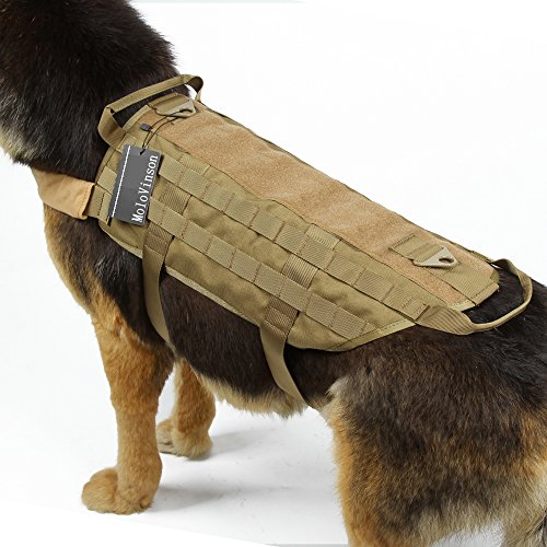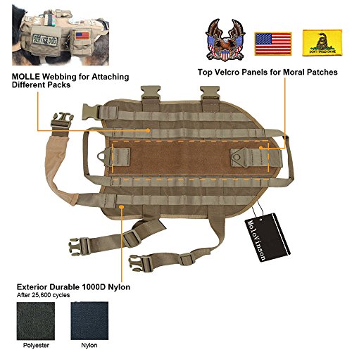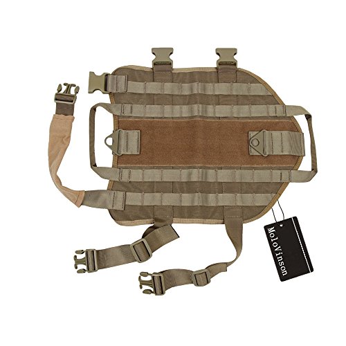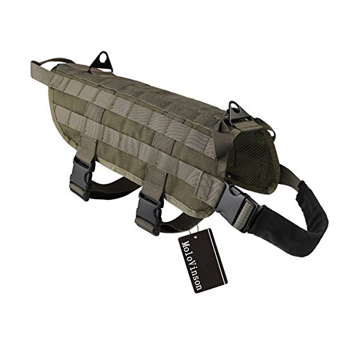 -. Binding : Misc. -. Brand : MoloVinson -. Feature : Top Notch Construction: Made of exterior rugged 1000D nylon with quick release plastic buckle; come with interior breathable mesh padding & soft padded neck strap cover as we care your beloved dog's wearing comfortable / Molle Dog Vest: With 2 MOLLE webbing on both side of the harness which are compatible with any MOLLE or MALICE-type pouches, easy to attach magazine pouches, water bottles, food snacks, etc / Two Handles Design: 2 carry handles are attached to both the front and the back of the harness for your dog's lead & control / Hook & Loop Panel: Top hook and loop panel runs entire length of the vest for you to attach your moral patches or dog patches / Various Sizes & Colors Available: Measuring your dog for proper fit can reduce the probability of receiving unsuitable size or return. Please check our Dog Sizing Chart before purchase. Your shopping experience is our first concern. -. Label : spanker -. Manufacturer : spanker -. PackageQuantity : 1 -. ProductGroup : Pet Products -. ProductTypeName : PET_SUPPLIES -. Publisher : spanker -. Studio : spanker -. Title : MoloVinson Tactical Dog Molle Vest Harness Training Camping Dog Vest with Two Handles Military Patrol K9 Dog Harness for Small Medium & Large Dog