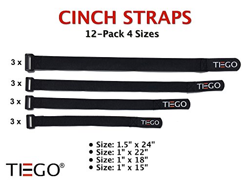 - 12-PACK MIX STRAPS AND CABLE TIES, MOST POPULAR 4 SIZES: pack includes (3) 24 inch x 1.5 inch, (3) 22 inch x 1 inch, (3) 18 inch x 1 inch, (3) 15 inch x 1 inch reusable hook and loop cinch straps with buckle.