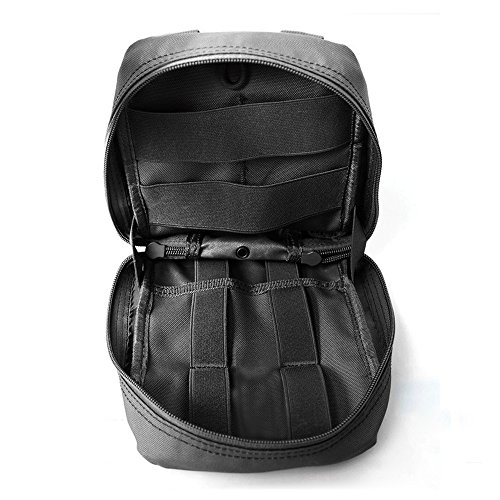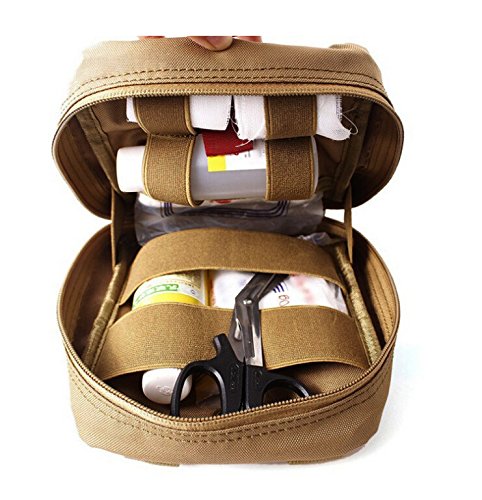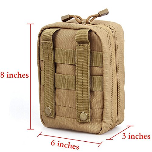 -. Feature : ☺ Dimension: 8"H X 6"W X 3"D, one item includes a Pouch, a Velcro Patch and a Carabiner. Made of 900D nylon material, water-resistant, anti-corrosion, durable and comfortable to use. / ☺ MOLLE attachments with buckle straps allow you to secure it to belt, tactical vest, backpack etc., and has a steel drain hole rivet in the bottom. / ☺ The elastic Molle straps inside the pouch for things like bandages, medical tape, quick clot gauze, trauma shears etc. A pocket under the vertical straps as well to help secure and separate your stuff. / ☺ Zippered opening across the top and both sides with double pulls allows you to open in either direction. Folds open in half to access everything, no need to dump all the contents to get to what you need. / ☺ Notice: the medical supplies are not included.