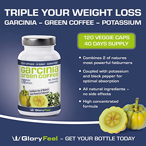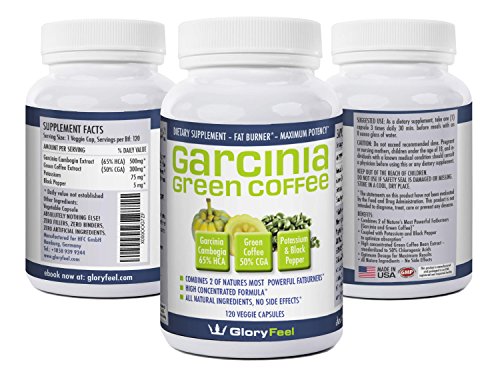 -. Binding : Health and Beauty -. Brand : Gloryfeel -. EAN : 0616806519655 -. Feature : EAT LESS & FEEL FULL: Our extract is tailor made to curb hunger pains and prevent you storing fat without restricting calories or changing your daily routine! / TRIPLE YOUR WEIGHT LOSS FORMULA. This product combines the most efficient Garcinia Cambogia Extracts (65% HCA) and Green Coffee Bean Extracts (50% CGA). The unique combination with Potassium and Black Pepper leads to an optimal absorption. 2 efficient ingredients coupled with optium absorption help to triple your weight loss. / LOOK GREAT - FEEL GOOD: Feel good while you are losing weight, naturally - The two weight loss supplements used work on various levels for women and men to lose weight. They support your metabolism, healthy levels of appetite and healthy levels of the important hormone serotonin. All natural! Works great for belly fat, even if you've fought weight loss all your life. Exercise not required to lose weight. Wear clothes you couldn't fit into before. Prepare yourself for compliments from the opposite sex! / ZERO SIDE EFFECTS - Most users report zero side effects. No jitters. No nausea. No headaches. In fact, to the contrary, lots of people actually saw their mood improve (perhaps due to the reduced blood sugar fluctuations)! / 100% MONEY BACK GUARANTEE - When you order today, you're protected by our risk-free, no-questions asked money back guarantee and world class customer service! -. Label : gloryfeel -. LegalDisclaimer : The statements on this product have not been evaluatedby the Food and Drug Administration. This product is notintended to diagnose, treat, cure or prevent any desease. -. Manufacturer : gloryfeel -. MPN : 0616806519655 -. PartNumber : 0616806519655 -. ProductGroup : Health and Beauty -. ProductTypeName : HEALTH_PERSONAL_CARE -. Publisher : gloryfeel -. Studio : gloryfeel -. Title : The BEST combination of Garcinia Cambogia Extract And Green Coffee Extract available, 120 Caps proven successful appetite suppressant and weight loss supplement -. UPC : 616806519655