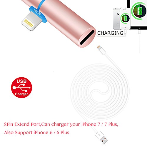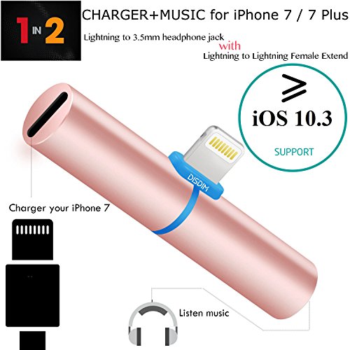 2 in 1 design: DISDIM lightning to 3.5mm adapter dedicated to enable you to play audio from your iPhone on your headphones, earphones and bluetooth speaker with 3.5mm aux ports. You could enjoy music and charging your phone at the same time. This iPhone 7 aux charger adapter does not support music control and phone calls control. It can support iOS 10.3.